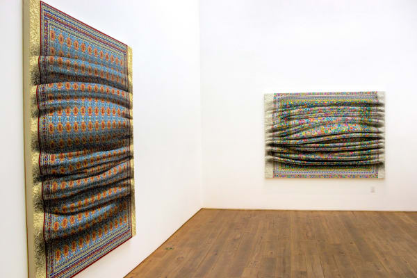 With actual rugs and imagery, Santín’s initial phase is the research and maneuvering of source material: the study of textile and how it deforms when it hides an undefined volume. A low-tech approach to image rendering on a primed surface follows. Then comes the application of paint, changing and blending the oil, changing the pressure in the compressor machine–as every oil has a different density–, drying, layering, revealing, hiding, and repeating. The process ends with the application of chromatic shadows to complete the painting. A work of precision and innovation, leaving little room for unexpected outcomes.