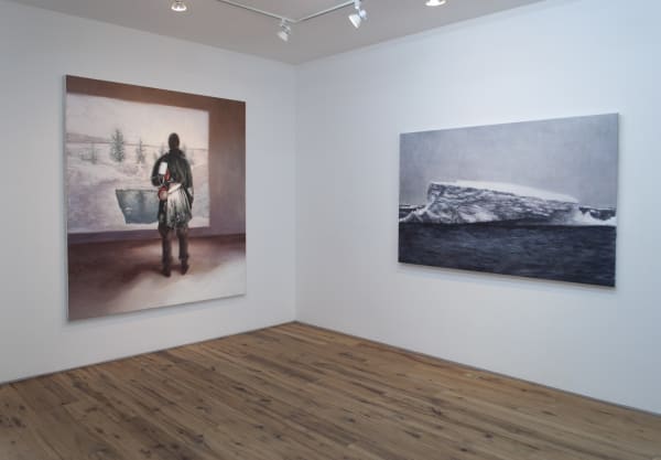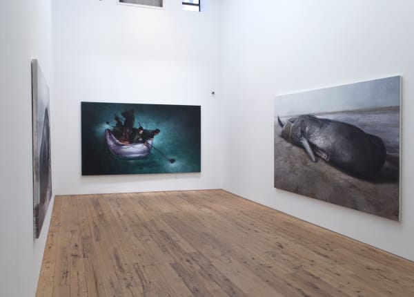 Vehabović’s current body of work embodies literary adventure themes, such as men at sea and fantastical animals, including a huge beached whale like creature. These works are inspired by the song “My Donal,” written in the 1960s by Scottish author Owen Hand. The song’s narrative, set around the 17th or 18th century, addresses the pain endured by the worrying wives of whalers as they grappled with the uncertainty of what would happen to their husbands while at sea. In Cursed Crew, Vehabović mesmerizes us with his use of color: the azure blue of the sea beckons us while the reflections of lights on the whalers’ faces warn us to keep our distance. Similarly, the work titled Grytviken engulfs the viewer in a haunting sea of darkness as the stark white iceberg looms under the still, grey sky.