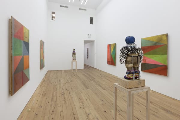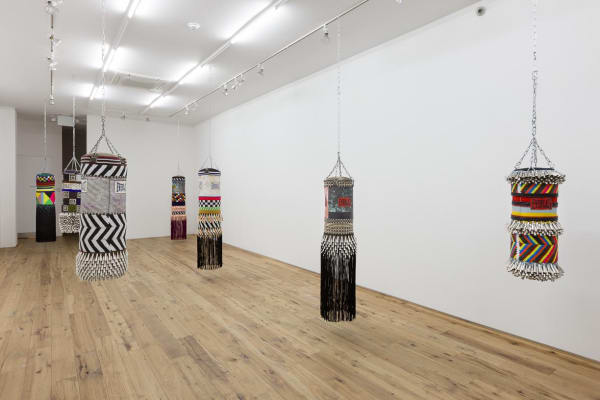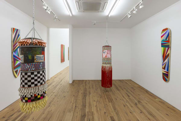 Jeffrey Gibson’s paintings and sculptures are inspired by the traditional craft and modern arts of Native American cultures. His sense of pride and desire to reclaim ownership of these histories counter the potentially negative connotations of craft that have been placed onto Native American Art, situating his work within the pantheon of abstract modernism.