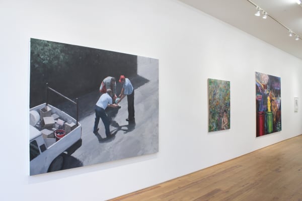 Robert Fekete's We Have the Same Feelings nests image within image and environment within environment to probe into the process of seeing. His four figures, gazing at or through a canvas-window hybrid, interact with the waterfall as mimetic product, cleaved from its essence through a perceptual translation that manifests in two-dimensional dullness. With this natural landscape devoid of sensory intimacy and encased in rectangular borders, Fekete's work interrogates our relationship to embodied experience, confronting the viewer with an alienated existence comprised of flattened moments. Whereas Fekete presents the seen in its final alienated form, Zlatan Vehabović's July 17th fixes that which is seen and that which is felt in their process of progressive divergence, with fragmenting forms and spectral discharge straddling the production and destruction of schematic totalities. Whether hollowing out into ready-at-hand givenness or bursting forth with extra-visual resonances, Vehabović builds tension between the facades and fleeting substance that characterizes the contemporary environment's individual parts.