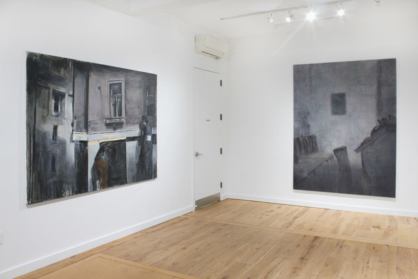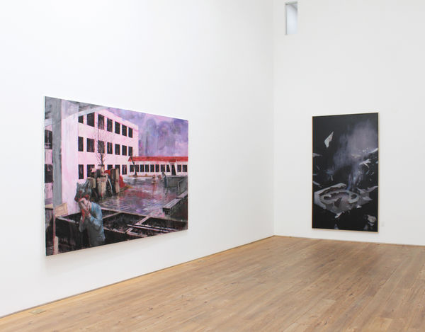 Robert Fekete's We Have the Same Feelings nests image within image and environment within environment to probe into the process of seeing. His four figures, gazing at or through a canvas-window hybrid, interact with the waterfall as mimetic product, cleaved from its essence through a perceptual translation that manifests in two-dimensional dullness. With this natural landscape devoid of sensory intimacy and encased in rectangular borders, Fekete's work interrogates our relationship to embodied experience, confronting the viewer with an alienated existence comprised of flattened moments. Whereas Fekete presents the seen in its final alienated form, Zlatan Vehabović's July 17th fixes that which is seen and that which is felt in their process of progressive divergence, with fragmenting forms and spectral discharge straddling the production and destruction of schematic totalities. Whether hollowing out into ready-at-hand givenness or bursting forth with extra-visual resonances, Vehabović builds tension between the facades and fleeting substance that characterizes the contemporary environment's individual parts.