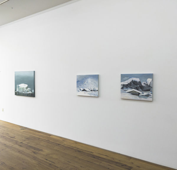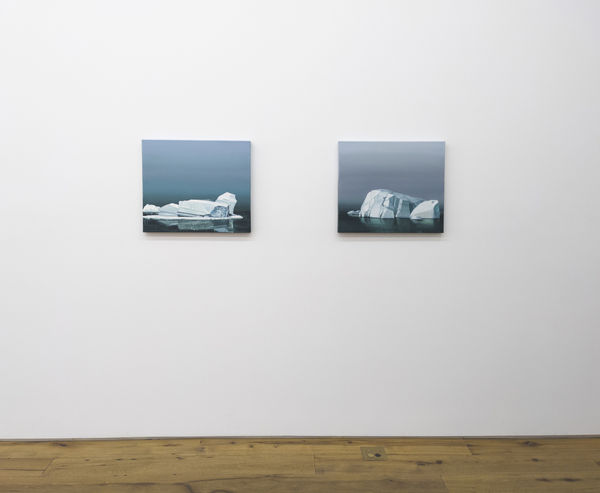In Willy Lott’s House, Puder references a painting by John Constable that is influential in his work. The painting depicts a small American period house with contrasting dark clouds in the background and a well-lit foreground. The lighting is dramatic: electric lights, reflection on the water, an absence of sunlight and moonlight. A recurring question for Puder is how would one go about a painting today that was painted 100 or 200 years ago? He concludes that the first step is to recycle the title, closely followed by contemporary additions to the original version. The Icebergs, the title of a painting by American landscape artist Frederic Edwin Church, was painted in 1861. With this work, Puder has used the image in varying versions in his own work to address pressing contemporary issues. The icebergs, the mountains, and the alps are part of the artist’s experiences, while also acting as metaphors for cultural and political changes.