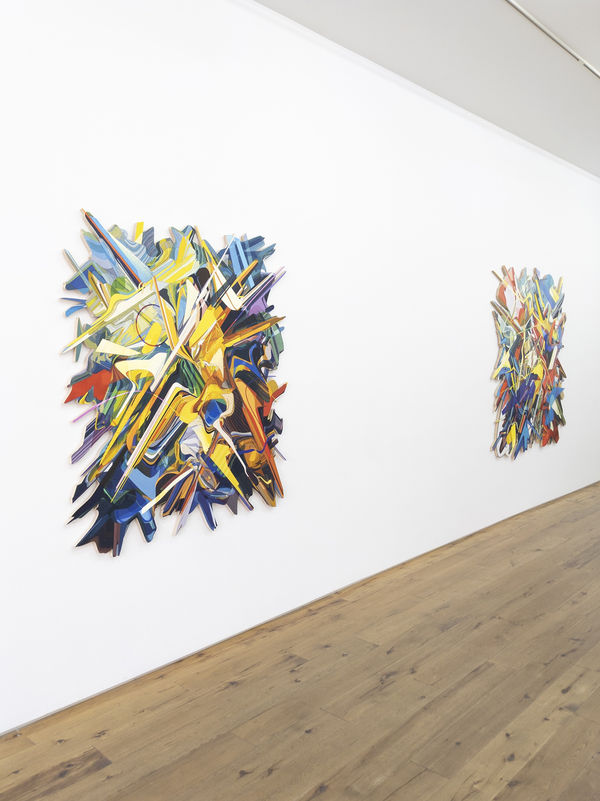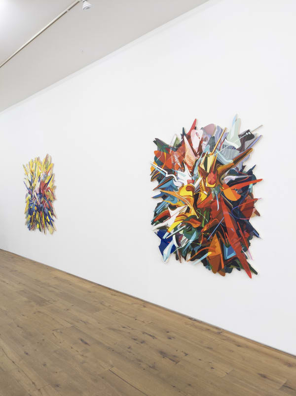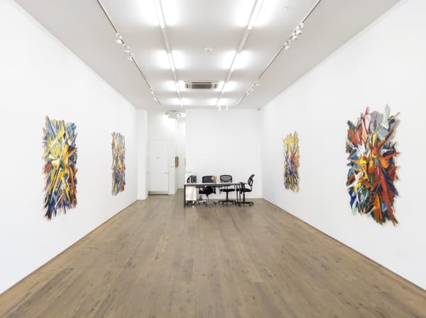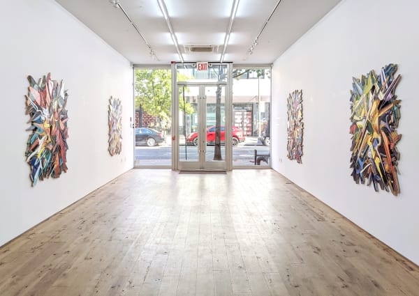 Omar Rodriguez-Graham’s paintings are the results of his ongoing exploration in the terrains of color, texture, and time. His points of departure are historical Renaissance or Baroque figurative paintings. He then digitally deconstructs the image until there is an almost unrecognizable abstract composition. To this he begins to make further choices as to paint texture, colors, and shaping. In these recent oil paintings, the bands of colors partly determine the edges of the painting; they splay out to the periphery as shards or arrows. By not constricting the painting to a rectangle or circle he allows the colors, textures, and shapes on the interior to determine the edges. The result is a dynamic composition which allows the paintings to also function as wall sculptures.