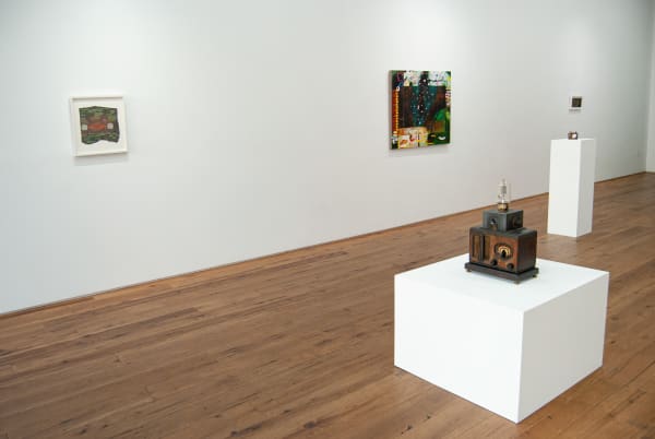 Her paintings have a phantasmagoric quality with illusive narratives: often with writing and numerology. Many of the sculptures are small and appear to be antique commercial objects, but in reality, they are carefully composed fictions. Her sculptures are assemblages of scavenged objects, many hand-constructed or resurfaced, to be a believable facsimile of original, pre-existing devices. She assigns these ‘machines’ specific supernatural abilities that transcend our human existence in the world. They are physical metaphors for universal hopes.