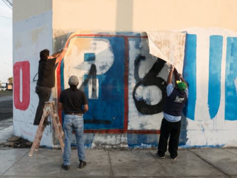 In his signature work Martinat sources graffiti from walls and surfaces throughout South America. He’s developed a technique to extract layers of paint that is then peeled away maintaining the grittiness of the wall with its imagery. He appropriates logos, letters and phrases that capture the political tension of the populace. These “paintings” have a new life on the white walls of galleries, museums, and private collections. They are at once beautiful and unusual objects while retaining their visceral immediacy, transporting the emotional tension of the source.