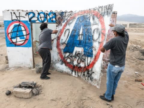Red Cross is the only work in this exhibition that does not belong to a political party. It features the logo of the Peruvian red cross, extracted from an abandoned medical post in the middle of the pandemic. This image of the double cross symbolizes the two congruent emergencies facing the country.