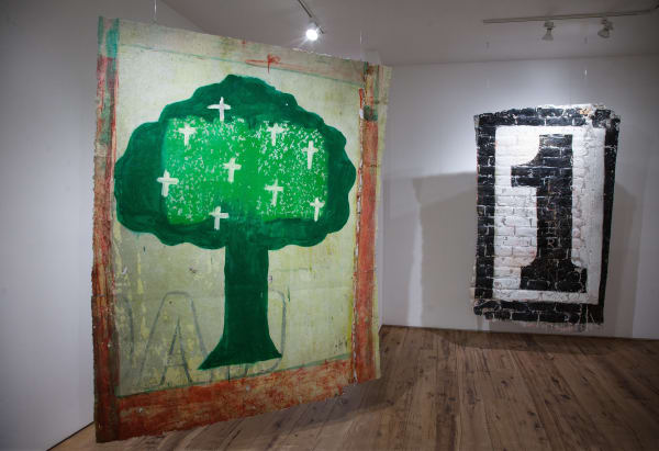 The work Ladrón was extracted from propaganda of a congressional candidate in the right-wing Fujimora Party, whose original leader is now serving a 25-year prison sentence. Congressional candidates typically paint their names, party logo and the number that they represent on the ballot as seen here. Someone has clumsily scrawled ‘Ladrón’ Spanish for thief into the original paint. Martinat’s extraction captures the dialogue of the people intervening with this political propaganda. Another impactful work has a green tree, the logo of the political party Fuerza Inka Amazónica. Within the leafy foliage there are numerous crosses that were added by a street artist.