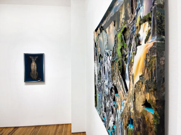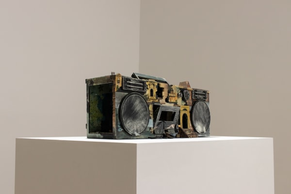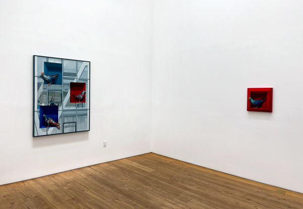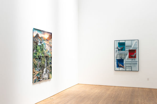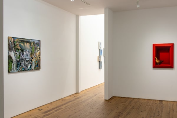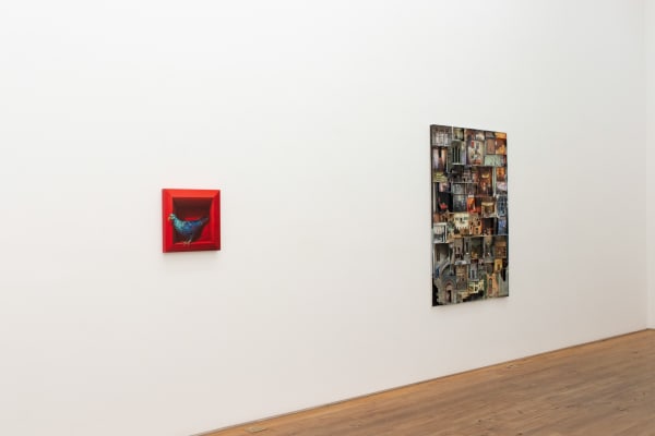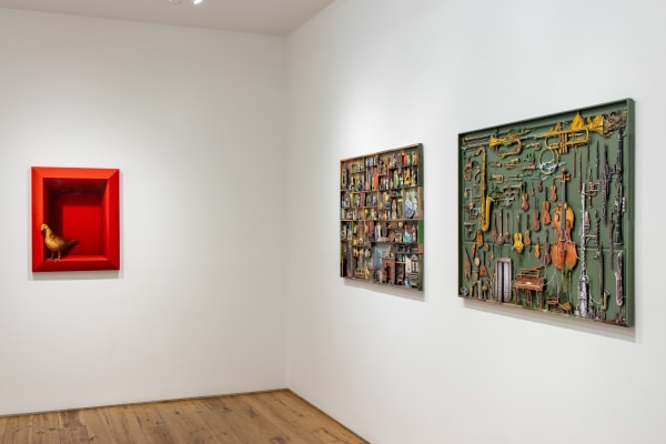 Through the lens of two distinct yet complementary artistic practices, Chris Jones and Clive Smith explore these physical and psychological spaces where someone, or some things, are often isolated from public view. In what has become his signature style of sculptural collage, Chris Jones’ New Antiques and Music Room (both 2024) group collections of reborn objects like vases and violins arranged in miniature domestic rooms. As voyeurs of sorts, Clive Smith’s meticulously painted doves and pigeons in Sky Stack (2024) and Bierstadt Dove (2023) are perched in trompe-l’œil cocklofts watching and waiting, just out of reach from what may be occurring in all of those spaces below.