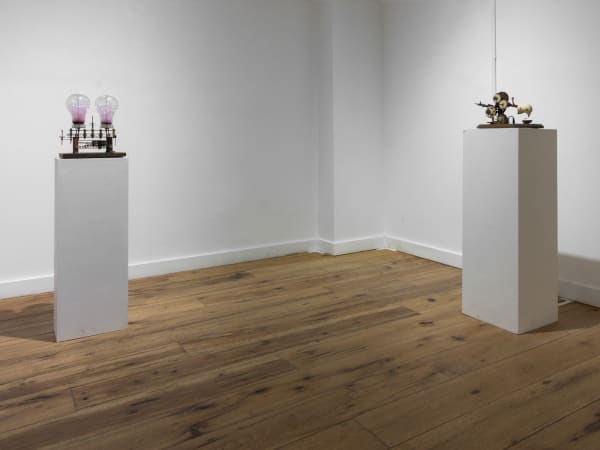 Halfway between castaway junk and science apparatus, Han’s new series of sculptures feature clinical glass jars bubbling with tiny dye-filled bubbles. In constant effervescence, they resemble heads teeming with biological opportunities. Here, Time is an essential element—believing that nothing in the world ever remains stationary, everything is in flux, Han’s dynamic installations encourage viewers to pause and watch.