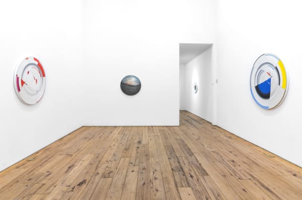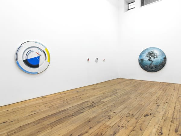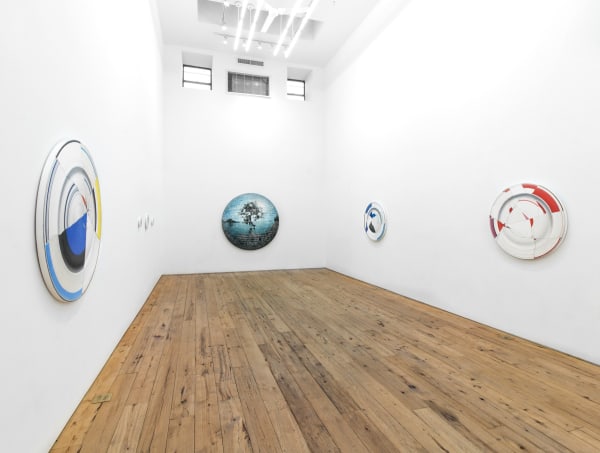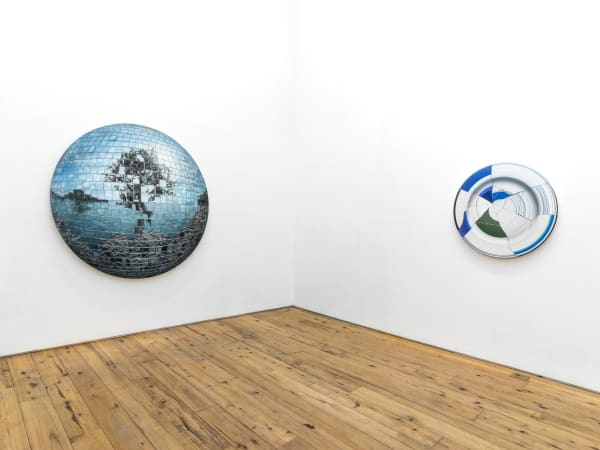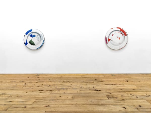 In a series of “broken plate” paintings, Smith continues his ruminations on the insatiable demand of mass consumerism and its effects on the environment. Realistically painted cracked plates on round or irregular shaped canvases are inspired by the Japanese art of Kintsugi where repair aggrandizes a broken pottery’s beauty and dignity. The scars, mishaps, and accidents of life leading to the present moment are celebrated. By assembling fragments of different broken plates, Smith discovers accidental “readymade” compositions to work within; the geometric patterns on the plates also function as vehicles for him to explore formal compositional ideas more regularly discussed in purely abstract works.