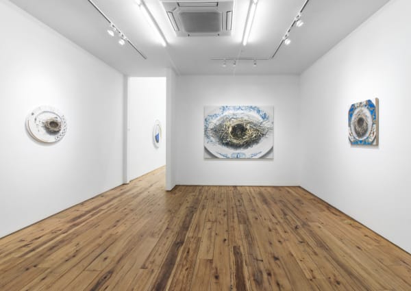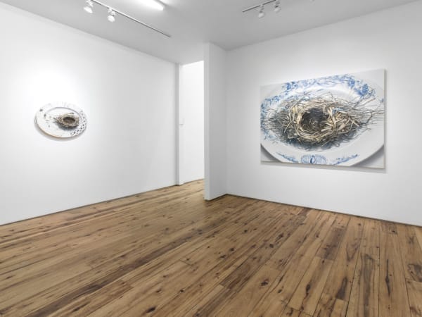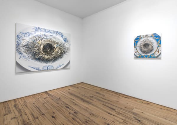 In a series of new paintings, Clive Smith, a celebrated conceptual portraitist, eschews the human figure and yet captures the intensity seen in the best of portraits. Here Smith places an intricate bird-nest on an exquisite ceramic plate. In this incongruous juxtaposition, Smith tacitly comments on an inconvenient issue: species extinction by unintentional human consumption of the natural world. “Beak, Claw, Hand, Brush (1.9.1914)” refers to the demise of the Passenger Pigeon, once the most numerous of birds in North America. At 1pm on 1st September 1914, the last of the species, named Martha, died in the Cincinnati zoo; the first time the exact moment a species disappearing was recorded. Man exhausts the planet; a very topical concern. Smith is not accusatory, nor does he lobby for a solution, rather he raises necessary questions.