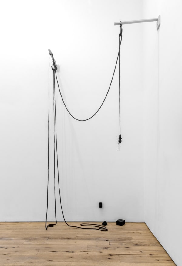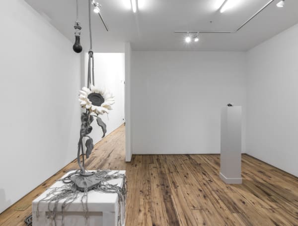 The melancholy of the work is offset by lighter moments, as rubber itself, being spineless and floppy, is facetious in nature. In Suicidal Sunflower (2014), one of her most complex and loaded works, a gray and white sunflower finds its own weight too heavy to bear and attempts to hang itself from a dangling black bulb. The sunflower is likely a stand-in for the artist and the bare bulb is a fixture in countless studio representations from Picasso to Philip Guston.